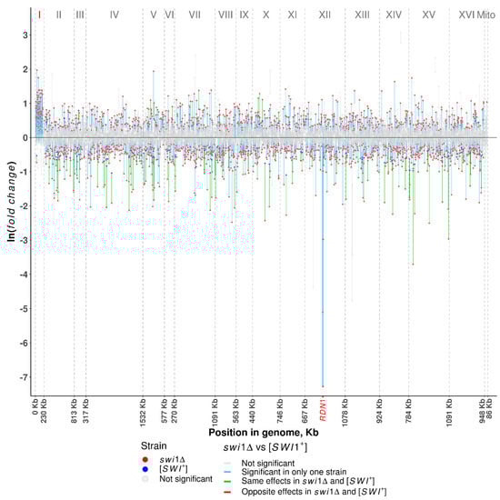 Distribution of differentially expressed genes along the chromosomes. Plotted on the y-axis is the ln fold difference between the swi1Δ or [SWI+] and [swi−] strains. Plotted on the x-axis are genomic coordinates. Vertical dashed lines denote the borders of chromosomes with the length of chromosomes shown on the x-axis and the name of chromosomes shown in the upper part of the plot. Red dots denote the significant (FDR < 0.001) changes in the swi1Δ and blue dots denote the significant changes in the [SWI+] strains. Grey dots denote nonsignificant changes in all strains. Lines connecting changes in the same genes, are (i) grey when changes in both swi1Δ and [SWI+] strains are nonsignificant, (ii) blue when change is significant in only one strain (swi1Δ or [SWI+]), (iii) green when a gene is up- or downregulated in both swi1Δ and [SWI+] strains, and (iv) red when a gene is upregulated in one strain and downregulated in another.