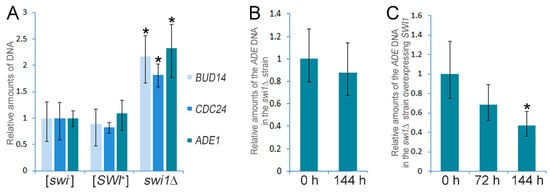 The deletion of SWI1 was found to cause an increase in the expression of ~50% genes located on the chromosome I (Figure 2, Table S5). This mean was remarkably high for the chromosome I, since for other chromosomes, it varied from 6.9 to 14.4% of the total number of genes (Table S5). Based on these data, we hypothesized that the SWI1 deletion could cause the chromosome I disomy. To clarify whether the chromosome I is duplicated in the swi1Δ strain, we extracted genomic DNA from the [SWI+], [swi−], and swi1Δ strains and performed a quantitative polymerase chain reaction (qPCR) using three genetic markers (ADE1 presented by the ade1-14UGA nonsense allele which was previously found to be upregulated in the swi1Δ strain [], BUD14, and CDC24) located on the chromosome I. The results of the qPCR demonstrated that the copy numbers of all three genes, ADE1, BUD14, and CDC24, are approximately two times higher in the swi1Δ strain in comparison with the [SWI+] and [swi−] strains (Figure 3A), thus supporting the data obtained with RNA-Seq and confirming the chromosome I duplication in the swi1Δ strain.