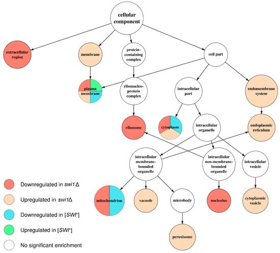 In order to specify the effects of the observed transcriptional changes on cell physiology, we performed an annotation of several acquired sets of differentially expressed genes. We started with testing the sets standing for [SWI+] to [swi−] and swi1Δ to [swi−] comparisons for over-represented Gene Ontology terms using the topGO package for R language (Table S6). The resulting terms were then mapped onto shared term hierarchy graphs depicting three primal ontologies, namely the Biological Process (BP), the Cellular Component (CC), and the Molecular Function (MF) (Figure 4, Figure 5 and Figure 6, Figures S1–S3, respectively). In addition, such analysis was then repeated for swi1Δ to [swi−] DEGs, but with the genes located on the chromosome I excluded to avoid possible bias introduced by an adaptive duplication in the deletion-affected samples; this, however, resulted in slight changes in GO mapping of the repressed gene subset (addition of one term per both BP and MF ontology mapping and exclusion of only one term from BP mapping and two terms from CC mapping, respectively, see Table S6).