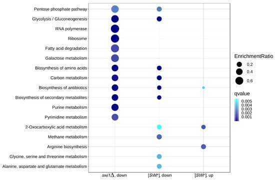 To validate the obtained results and to specify their effect on particular metabolic and functional pathways, we then performed a KEGG Pathway overrepresentation test on down- and upregulated genes in each condition (Figure 7). Surprisingly, no overrepresented pathways were found in the deletion-promoted genes. In the other three subsets, 17 pathways were found to be overrepresented overall, with seven pathways present in at least two subsets. Among these acquired pathways, several were found to be ‘global’ metabolic pathways and thus were dismissed as non-significant, and the rest were visualized via the Pathview R package for a closer look (Figure S4). The genes were mapped for both experimental conditions, even if in one of them, the pathway was not found to be over-represented. Deterioration of the carbohydrate metabolic pathways, such as the glycolysis and pentose phosphate pathway, seems to be concordant between prion- and deletion-affected samples, though the SWI1 deletion replenishes glucose dissimilation with the upregulation of genes recruiting alternative carbon sources to CoA acetylation (Figure S4A,B). At the same time, the galactose metabolism appears to be downregulated exclusively in the deletion state (Figure S4C). Another overrepresented trait of deletion is massive downregulation of the nucleobase synthesis (Figure S4D,E), considering both major biosynthesis pathways and reactions leading to nucleobase-containing cofactors and other nitrogen-containing compounds. The purine synthesis impairment is also partially reproduced in the [SWI+] samples, though the repression there mostly affects downstream reactions, such as inter-nucleobase transmutation rather than major pathways. In addition, [SWI+] tends to both repress and promote specific amino acid metabolic pathways. Despite the fact that the ‘biosynthesis of amino acids’ pathway was overrepresented in the set of genes repressed by the SWI1 deletion, none of the specific pathways were found by the overrepresentation test for the deletion-affected samples, so we mapped these genes onto metabolic pathways acquired for prion-regulated genes, as well as tryptophan biosynthesis, which could be related to the observed phenotype (Figure S4F–H). Surprisingly, prion and deletion showed a similar effect on arginine biosynthesis, with four genes concordantly upregulated and one gene downregulated (Figure S4G). All these results concur with the overrepresented terms obtained for the BP GO ontology for different amino group-containing moieties, including both nucleobase-containing metabolites and amino acids.