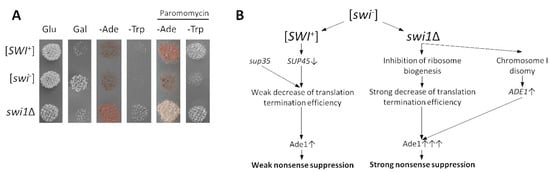 Notably, the prion formation by SWI1 does not cause a significant decrease of the translation-related genes, which can be easily monitored by the growth of the [SWI+] strains containing respective nonsense mutations (ade1-14UGA and trp1-289UAG) on the media that lacked adenine or tryptophan (nonsense suppression) (Figure 8A). We found that the SWI1 deletion causes strong omnipotent nonsense suppression, even in the presence of the wild-type Sup35 (eRF3) (Figure 8A), while [SWI+] causes nonsense suppression either in the presence of mutant Sup35 with decreased eRf3 functional activity [,] or on the media with aminoglycoside antibiotics [] that block different stages of translation [], imitating the effects of the SWI1 deletion. Taking together, in contrast to [SWI+], the deletion of the SWI1 gene causes global inhibition of translation that is detected phenotypically.