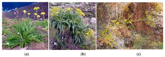 Photographs of three representative species of the woody Sonchus alliance in the Canary Islands. (a) Sonchus acaulis, a caudex perennial (photo credit: Seung-Chul Kim); (b) Sonchus canariensis, a tall shrub (photo credit: Seung-Chul Kim); (c) Sonchus webbii, a tuberous herbaceous perennial (photo credit: Aurelio Acevedo).