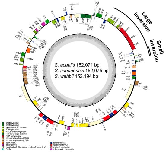 The silica-gel dried leaves sampled from natural habitats in the Canary Islands, Spain were used as sources of DNA. Total genomic DNA was isolated using the DNeasy Plant Mini Kit (Qiagen, Carlsbad, CA, USA). An Illumina paired-end (PE) genomic library was constructed and sequenced using the Illumina HiSeq platform according to the standard Illumina PE protocol. The sequence reads were assembled by using a CLC genome assembler (ver. 4.06 beta, CLC Inc, Aarhus, Denmark) with coverage of 256.85× for S. acaulis, 223.30× for S. canariensis, and 158.08× for S. webbii. Annotation was performed with the Dual Organellar GenoMe Annotator [], ARAGORN v1.2.36 [], and RNAmmer 1.2 Server []. Using Geneious v8.1.6 (Biomatters Ltd., Auckland, New Zealand), the draft annotation was inspected and corrected manually by comparison with homologous genes in Lactuca sativa (DQ383816) and Sonchus oleraceus (MG878405) from the NCBI GenBank database. The completed sequences were registered in GenBank under accession numbers MK033506 (S. canariensis), MK033507 (S. acaulis), and MK033508 (S. webbii). OGDRAW [] was used to draw a circular chloroplast genome map (Figure 2).