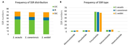 In this study, very similar numbers of potential SSRs were identified from the chloroplast genomes of three Sonchus species by using MISA []: 80 from S. acaulis, 78 from S. canariensis, and 78 from S. webbii. The SSR search parameters were set for 1–15 (mono-nucleotide motifs with 15 minimum numbers of repetition), 2–5, 3–3, 4–3, 5–3, and 6–3. Interestingly, SSRs for all three Sonchus species were mainly distributed in the coding regions (61–63%), with much lower quantities distributed in the non-coding introns (4–5%) and intergenic regions (33–34%). Considering the quadripartite regional occupancy of SSRs, the IR and SSC regions were remarkably lower in overall SSR frequency compared with the LSC region: 19–20% from the SSC region and 11–12% from each of the two IR regions versus 56–59% from the LSC region (Figure 4A). However, SSC region occupies the smallest size (12%) in whole chloroplast genome, relatively to LSC (55%) and IR (16%), therefore, SSC region is most enriched in the distribution of SSRs, when taking into account its relative region size. Among the identified SSRs, the tri-nucleotide motifs showed most abundant repeat length (63–66 (81–83%)) with relatively lower proportions of other SSR types (approximately 5–6% of mono-nucleotide, 5% of di-nucleotide, and 6–8% of tetra-nucleotide motifs). There were no penta-nucleotide motifs in all three species. The hexa-nucleotides of S. acaulis showed unique characteristics (Figure 4B).