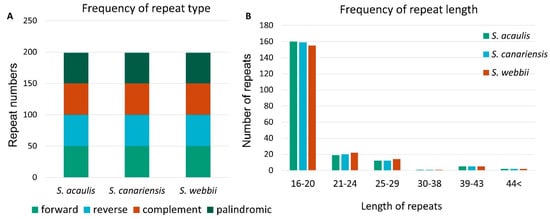 Repeat numbers per repeat type and repeat length of three Sonchus species. (A) Variation in the distribution of forward, reverse, complement, and palindromic repeats in the chloroplast genomes of each Sonchus species. (B) Number of different repeat lengths of each Sonchus species.