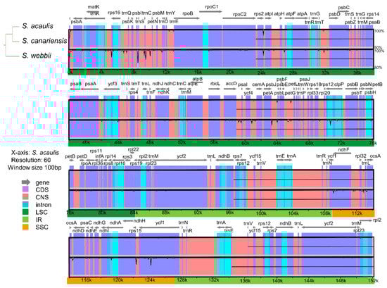 Comparison of the chloroplast genomes of three Sonchus species generated by mVISTA; S. acaulis, S. canariensis, and S. webbii. Sequence identity is portrayed with cut-off of 50% identity. The Y-scale axis represents the percent identity within 50–100%. Grey arrows indicate genes with their orientation and position. Genome regions are color-coded as blue blocks for the conserved genes (CDS), pink blocks for the conserved non-coding sequences in intergenic regions (CNS), aqua-blue blocks for introns. Thick lines below the alignment indicate the quadripartite regions of genomes; LSC region is in dark green, IR regions, in light green, and SSC region, in orange. Black bordered white peaks shown in genome regions indicate the divergent regions with sequence variation among three Sonchus species.