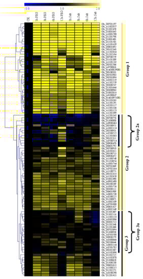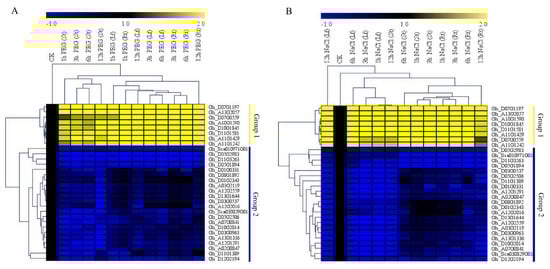 RT-qPCR analysis of the 30 highly upregulated cotton cytochrome P450 genes as obtained from the RNA sequence data. The heat map was visualized using the Mev.exe program (shown by log 2 values) in control, and in treated samples after 0 h, 1 h, 3 h, 6 h, and 12 h of drought and salt treatment. (A) Osmotic stress treatment by 17% PEG-6000; (B) salt stress treatment by applying 250 mM of NaCl solution. Yellow—upregulated, blue—downregulated, black—no expression.