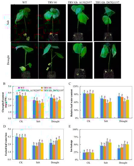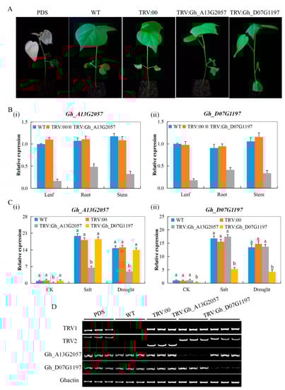 Phenotype observed in the silenced plants with the TRV2:00 empty vector, wild-type plants and CYP450-silenced plants at 12 days post-inoculation. (A) No obvious symptoms in the leaves of the TRV:00-infected plant (positive control); in each experiment, six plants were used and there were three replicates. (B) RT-qPCR analysis of the changes in the expression level of the two CYP450 genes in the leaf, stem, and root tissues of upland cotton, G. hirsutum, plants treated with VIGS before stress exposure. (C) RT-qPCR analysis of the changes in the expression level of the two CYP450 genes in the leaf tissues of G. hirsutum cotton plants, wild type, TRV:00 and the VIGS plants under drought and salt stress conditions. (D) Gel electrophoresis in determining the effectiveness of gene silencing. TRV2:00 represents the positive control infused with the TRV2 empty vector; TRV2:Gh_Gh_A13G2057 and TRV2:Gh_Gh_D07G1197 represent the CYP450-silenced plants, PDS: phytoene desaturase; WT: wild type (non-VIG plants). Error bars represent the standard deviation of three biological replicates. Letters a/b indicate statistically significant differences (two-tailed, p < 0.01). CK: untreated, Salt: 250 mM NaCl treatment, Drought: 17% PEG-6000 treatment.