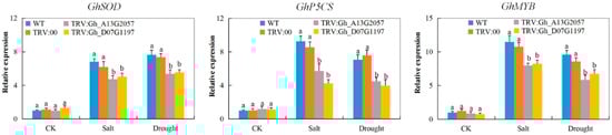 Stress-responsive genes (GhSOD, GhP5CS, and GhMYB) expression profiling in CYP450s-VIGS plants. GhActin was used as the reference gene. The letters a/b indicate statistically significant differences (two-tailed, p < 0.01). Error bars of the gene expression levels represent the standard deviation of three biological replicates. CK: untreated, Salt: 250 mM NaCl treatment, Drought: 17% PEG-6000 treatment.