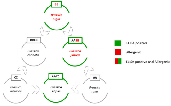 The angles of the U’s triangle are formed by three species with their own elementary genome: B. rapa (A-genome), B. nigra (B-genome), and B. oleracea (C-genome). The sides consist of three amphiploid species formed by the elementary genomes, B. juncea (AB), B. napus (AC), and B. carinata (BC). In this work, the main issue was to develop a tool to distinguish the allergenic mustard species (i.e., B. nigra and B. juncea) from the non-allergenic rapeseed (i.e., B. napus) that shows cross-reactivity with the commercial ELISA assays.