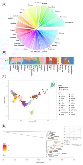 The observed heterozygosity of the horse breeds ranged from 0.2955 to 0.2748 (Table 1). The Morgan horses and Jinjiang horses showed relatively high heterozygosity, and the lowest value was observed in the Akhal Teke horse population. The expected heterozygosity of the Belgian horses and the Arabian horses was slightly higher in the horse populations studied (Table S1).