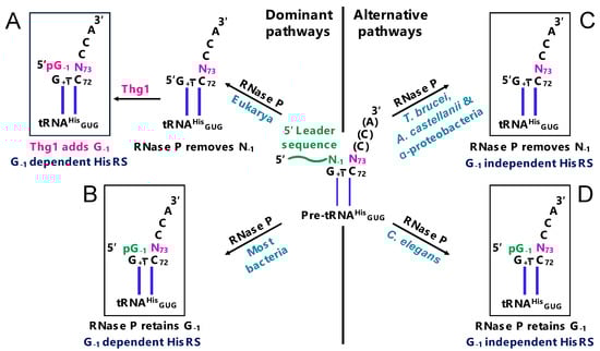Different pathways to establish tRNAHis identity. (A) tRNAHis identity in many eukaryotes. RNase P removes N−1 from pre-tRNAHis during the removal of 5′ leader sequence (shown in green). Then, tRNAHis guanylyltransferase (Thg1) post-transcriptionally adds G−1 (shown in pink). Histidyl-tRNA synthetase (HisRS) recognizes the Thg1-incorporated G-1 for the accurate histidylation of tRNAHis in eukaryotes. (B) tRNAHis identity in bacteria. G−1 is encoded in tRNAHis genes in most bacteria, and RNase P retains the genomically encoded G−1 during the removal of the 5′ leader sequence. HisRS recognizes the RNase P-retained G-1 for the accurate histidylation of tRNAHis in bacteria. (C) tRNAHis identity in several groups of α-proteobacteria, Trypanosoma brucei and Acanthamoeba castellanii. RNase P removes N−1 from precursor tRNAHis during the removal of the 5′ leader sequence. An atypical HisRS in these organisms is capable of aminoacylating G−1-lacking tRNAHis during histidylation. (D) tRNAHis identity in Caenorhabditis elegans (an atypical eukaryote). G−1 is encoded in tRNAHis genes, and RNase P retains the genomically encoded G−1, which is similar to bacteria. HisRS in C. elegans is capable of aminoacylating both G−1-containing and G−1-lacking tRNAHis.