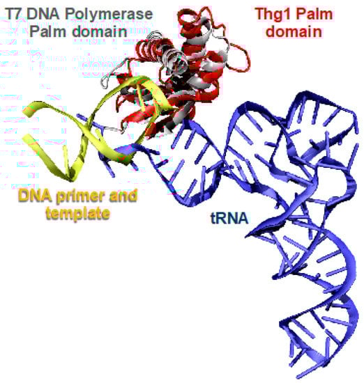- Hyde, S.J.; Eckenroth, B.E.; Smith, B.A.; Eberley, W.A.; Heintz, N.H.; Jackman, J.E.; Doublie, S. tRNAHis guanylyltransferase (Thg1), a unique 3′-5′ nucleotidyl transferase, shares unexpected structural homology with canonical 5′-3′ DNA polymerases. Proc. Natl. Acad. Sci. USA 2010, 107, 20305–20310. [Google Scholar] [CrossRef] [PubMed]