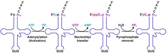 - Abad, M.G.; Rao, B.S.; Jackman, J.E. Template-dependent 3′-5′ nucleotide addition is a shared feature of tRNAHis guanylyltransferase enzymes from multiple domains of life. Proc. Natl. Acad. Sci. USA 2010, 107, 674–679. [Google Scholar] [CrossRef]