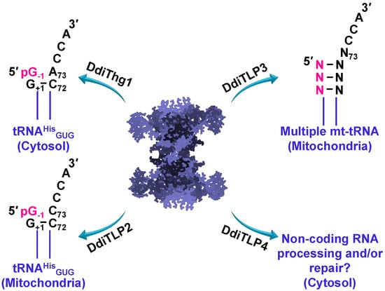 Non-redundant physiological roles for Thg1 and Thg1-like proteins (TLPs) in Dictyostelium discoideum tRNA 5′-editing. DdiThg1 catalyzes cytosolic tRNAHis maturation by incorporating G−1 across from A73. DdiTLP2 catalyzes mitochondrial tRNAHis maturation by incorporating G−1 across from C73. DdiTLP3 catalyzes mitochondrial tRNA 5′-editing by repairing 5′-truncated tRNAs resulting from the removal of one or more mismatched nucleotides encoded in the precursor tRNAs. DdiTLP4 function remains unknown to date, but potentially this essential cytosolic enzyme is involved in non-coding RNA processing and/or repair in D. discoideum.