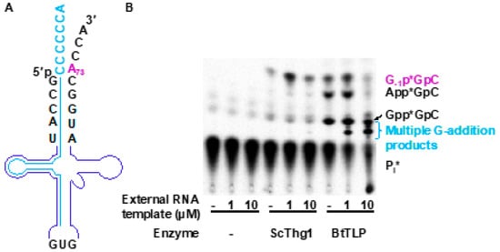 An external guide RNA oligonucleotide-mediated approach to manipulate nucleotide addition by Bacillus thuringiensis TLP homolog (BtTLP). (A) Schematic representation of tRNAHis (backbone in purple) hybridized to the external guide RNA oligonucleotide template (shown in blue). (B) Activity assay using the external guide RNA template and analyzed by thin-layer chromatography (TLC). Identities of the labeled reaction products are consistent with the known migration patterns of these species that have been validated by previous assays []. Nucleotide addition was tested using Saccharomyces cerevisiae Thg1 (ScThg1) and BtTLP with varying concentrations of the external guide RNA template (0 μM, 1 μM, and 10 μM, as indicated). In the absence of the guide RNA template, ScThg1 efficiently adds G−1 and in contrast, BtTLP only weakly adds G−1 across from A73 (evident from the amount of the product G−1p*GpC, which is labeled in purple). BtTLP instead accumulates 5′-adenylylated and 5′-guanylylated intermediates (evident from the products App*GpC and Gpp*GpC, which are labeled in black respectively). In the presence of the external guide RNA template, ScThg1 still maintains its ability to add a single G nucleotide across from A73 in S. cerevisiae tRNAHis (Sc-tRNAHis, as evident from the product G−1p*GpC shown in purple), whereas BtTLP adds multiple G nucleotides using the 3′-CCCCCCA of the external guide RNA oligonucleotide as a template. This multiple addition is evident from the appearance of several lower migrating products, which are labeled in blue, and are absent in ScThg1-containing reactions. The precise number of G-residues added to the tRNA cannot be determined due to the inability of this TLC system to resolve the distinct species that contain more than three added G-nucleotides [,,], but the pattern of migration observed here is consistent with the migration described previously for these species.