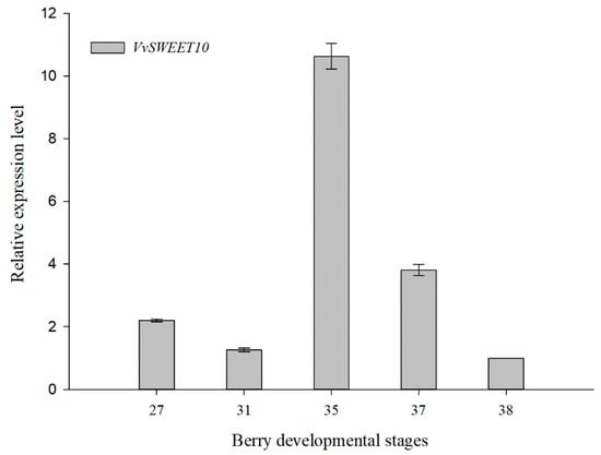 Developmental expression patterns of VvSWEET10 in grapes. The five developmental stages (i.e., E-L stages 27, 31, 35, 37, and 38) of the berry were used for qRT-PCR. The results are presented as means ± SD (n = 3).