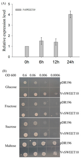 Functional characterization of VvSWEET10. (A) Low sugar supply stimulates the expression of VvSWEET10 in grape berry suspension cells. Berry suspension cells were cultured in a sugar-free medium for a starvation condition, and the transcript levels of VvSWEET10 were analyzed within 24 h. (B) Complementation of yeast EBY.VW4000 with VvSWEET10; drop tests were used to observe the cell growth on SD (-Ura) media supplemented with 2% maltose, 2% sucrose, 2% fructose or 2% glucose. Cells were grown at 30 °C for 3 days.