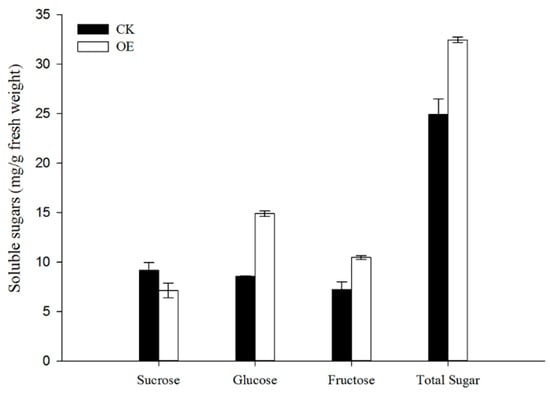 VvSWEET10 overexpression increases sugar accumulation in grapevine calli. The sugar contents of VvSWEET10-overexpressed calli (OE) and the control (CK) were analyzed by HPLC. Results are shown as means ± SD (n = 2).