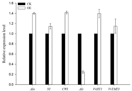 To further understand the changes in the sugar accumulation in VvSWEET10 overexpression, we performed RNA-Seq analysis of grapevine calli. As a result, we identified 3724 significant DEGs (22.19% of the expressed genes) in VvSWEET10-overexpressing grapevine calli compared with the CK (P < 0.01), of which 2039 genes were upregulated and 1685 genes were downregulated in the overexpressing calli, the fold change of upregulated genes ranged from 1.25 to 2198.5 and downregulated genes ranged from 1.24 to 93.97 (Supplemental Data S1). Many sugar transport/metabolism genes, including the well-characterized HT VvHT1, were upregulated in VvSWEET10-overexpressing lines (Table 1). VvHT1 transcripts are abundant in grape berry and encode the Glc transporter [21,54]. The TMT VvTMT3 was also significantly upregulated. The members of grape SWEET gene family also displayed distinct differences in our transcriptome data (Table 1, Figure S7). Five SWEET genes (i.e., VvSWEET2a, VvSWEET4, VvSWEET15, VvSWEET17a, and VvSWEET17c) were upregulated in overexpressing grapevine calli. Previous qPCR results indicated that VvSWEET15 was strongly expressed in berries after véraison, VvSWEET2a and VvSWEET17c were highly expressed in berry véraison, and VvSWEET17a was highly expressed in the fruit set of berries (Figure 1B). These results indicated that the sugar transport pathway was activated after overexpressing VvSWEET10. Although Suc transporters exhibited an insignificant difference between the OE and CK groups, a set of plant invertase genes exhibited a significant difference between the groups (Table 1). Invertase is a key enzyme in Suc metabolism and sugar transportation [55], and functions in hydrolyzing Suc into Glc and Fru. In our RNA-Seq data, four invertase genes were significantly upregulated, and one invertase gene was downregulated in the overexpression grapevine calli (Table 1). The transcriptome data were further validated by qRT-PCR. The genes mentioned above were selected, and these genes showed consistent results between the qRT-PCR and RNA-Seq data (Figure 6).