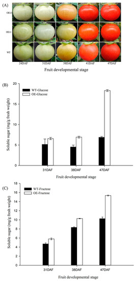 Hexose levels of transgenic lines (i.e., OE11 and OE13) and wild-type control in developing tomato fruit. (A) Photos of tomato fruit from VvSWEET10-overexpressed and wild-type (WT) lines; fruit ripening stages were determined by the day after flowering (DAF). (B) The glucose content in developing VvSWEET10-overexpressed (OE) and WT tomato fruits. (C) The fructose content of developing VvSWEET10-overexpressed (OE) and WT tomato fruits. Results are expressed as means ± SD (n = 3).