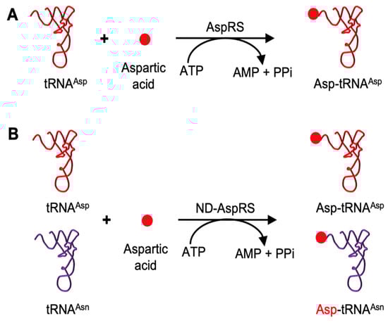 Canonical roles of AspRS and ND-AspRS. (A) AspRS aminoacylates tRNAAsp with aspartic acid to produce Asp-tRNAAsp. (B) ND-AspRS catalyzes the aspartylation of both tRNAAsp and tRNAAsn to produce Asp-tRNAAsp and the misacylated Asp-tRNAAsn.