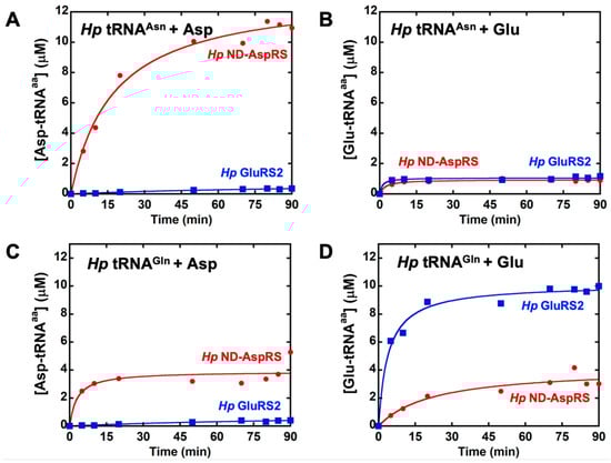 ND-AspRS has relaxed tRNA specificity and aspartylates both tRNAAsp and tRNAAsn to produce Asp-tRNAAsp and Asp-tRNAAsn, respectively [14,15]. We have previously demonstrated that the Hp ND-AspRS has this dual tRNA specificity, as expected [22]. Given the nature of the genetic code and decades of work characterizing the aaRSs, ND-AspRS should not demonstrate broader substrate specificity for non-cognate tRNAs or amino acids. We examined Hp ND-AspRS and GluRS2, a tRNAGln-specific GluRS [26,31], for possible cross-reactivity with overexpressed tRNAAsn and tRNAGln with both aspartate and glutamate (Figure 2). We performed these assays with longer time points to look at plateau levels of aminoacylation and to detect any low levels of aminoacylation. As expected, ND-AspRS produced Asp-tRNAAsn and did not produce Glu-tRNAAsn (Figure 2A,B, respectively). Unexpectedly, this enzyme showed aminoacylation activity in both assays with tRNAGln (Figure 2C,D), suggesting that it was producing the non-cognate product Hp Asp-tRNAGln and Glu-tRNAGln. However, because these tRNAs were overexpressed in vivo, a practice necessary to introduce required post-transcriptional modifications like queuosine [32] and 2-thiouridine [33], the tRNAs used in these experiments were contaminated with total Ec tRNA. Thus, the possibility also exists that Hp ND-AspRS is aminoacylating one or more Ec tRNAs instead. For comparison, GluRS2 showed only its expected activity, producing Glu-tRNAGln (Figure 2D), but not Asp-tRNAAsn, Glu-tRNAAsn, or Asp-tRNAGln (Figure 2A–C). We conducted these same, longer aminoacylation assays using the Ms ND-AspRS and ND-GluRS (Figure S2): We observed the same behavior with glutamate, indicating that this phenomenon is found in bacteria beyond H. pylori.