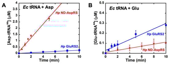 Next, we compared the initial rates and extents of glutamylation of total Ec tRNA by Hp GluRS2, an enzyme that naturally uses glutamate as its substrate [26,31], and Hp ND-AspRS, which unexpectedly also uses glutamate (Figure 4 and Figure S4). Here, to ensure that we could visualize this novel activity, we increased the concentration of each enzyme when looking at aminoacylation of a non-cognate tRNA. We also verified that Ms ND-AspRS has this ability to glutamylate total Ec tRNA (Figure S5). In these experiments, the ability of ND-AspRS to produce Glu-tRNAGlu is clearly apparent.