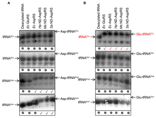 Some bacterial AspRSs aminoacylate E. coli tRNAGlu with glutamate producing Glu-tRNAGlu. Total Ec tRNA was aminoacylated with (A) aspartate and (B) glutamate by Ec GluRS, Ec AspRS, Hp ND-AspRS, Ms ND-AspRS, and Sa ND-AspRS. The aminoacylated versus deacylated tRNAs were separated in acid gels. 32P-labeled oligonucleotides specific for Ec tRNAGlu, tRNAGln, tRNAAsp, and tRNAAsn were used for each blot as indicated. Expected tRNA aminoacylation activities are indicated with a black check mark (✓); unexpected activities are indicated in red (✓); the absence of aminoacylation activity with a given tRNA is indicated with a no symbol (⦸).