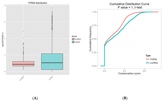 In our study, we found that the characteristics of lncRNAs were similar to previous studies [27]. We analyzed the expression level between lncRNAs and protein-coding genes, and the results showed that the expression levels of lncRNAs were lower than protein-coding genes (Figure 2A), and that protein-coding genes were more conservative than lncRNAs, resulting in a cumulative distribution curve of mRNA and lncRNA conservation scores (Figure 2B). The sequence results of lncRNAs showed a certain degree of site conservation among the species, with regard to the mRNAs. In our data, most of lncRNAs tended to be shorter in length, and they contained less exons than mRNAs (Figure 2C,D), and the lengths of ORFs in the lncRNAs were shorter than those of the mRNAs (Figure 2E).