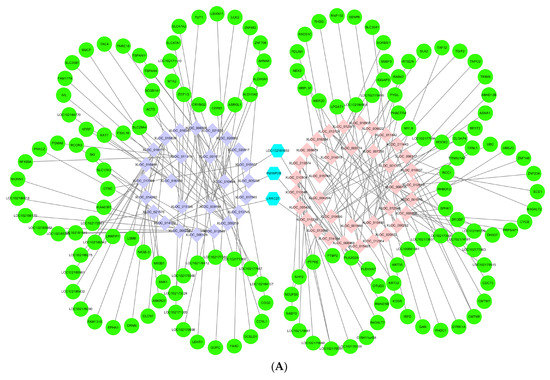 The network of differentially expressed lncRNAs. (A) Network of differentially expressed lncRNAs and target genes. Light pink: Up-regulation gene, lilac colour: Down-regulation gene, green: Target gene, light blue: Co-up-regulated and down-regulated target gene. (B) Network of qRT-PCR verification for lncRNAs and target genes. Light pink: Up-regulation gene, lilac colour: Down-regulation gene, green: Target gene.