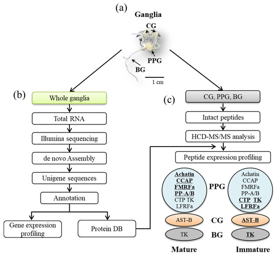 Workflow of transcriptomics and peptidomics experiments to identify neuropeptides of immature and mature female Haliotis discus hannai and a summary of the results in the present study. (a) Ganglia of abalone, cerebral ganglion (CG), pleuro-pedal ganglion (PPG), and branchial ganglion (BG); (b) Differentially expressed genes (DEGs) between mature and immature stages by transcriptome analysis; and, (c) Overview of increased (bold and underlined) or decreased neuropeptides by peptidome analysis.