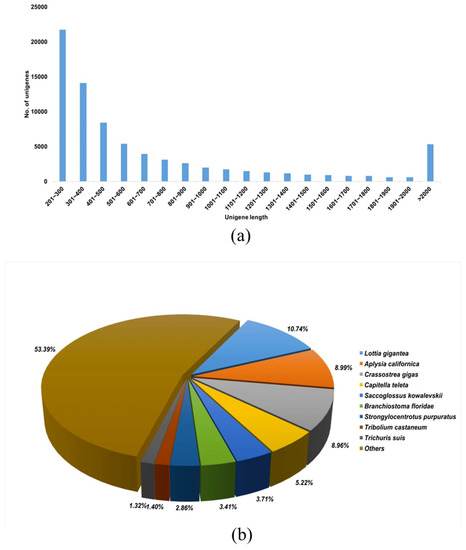 Overview of the Haliotis discus hannai transcriptome. (a) Overall length distribution of unigene reads; (b) Species distribution of the best of BLASTx hits of transcripts against the NCBI NR database.