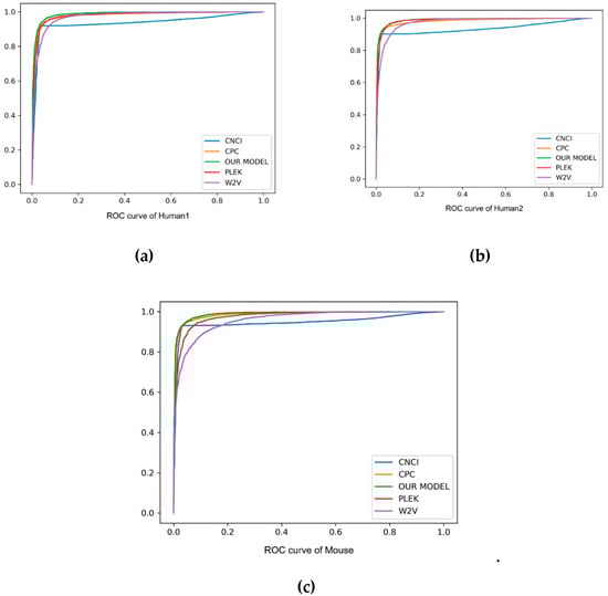 The ROC curve of human and mouse, with “false positive rate” as the horizontal axis and “true positive rate” as the vertical axis. Different method results are marked in different colors. Particularly, our method is marked in green.