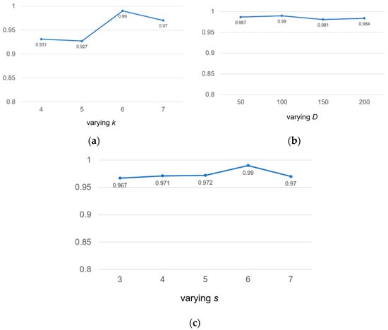 We valued k at 4, 5, 6 and 7, respectively. According to Figure 5a, we found that if the value of k was too small, not enough useful information could be extracted. If the value of k was too large, the exponential growth of vocabulary will occur. Therefore, we chose the value of k to be 6 for calculation.