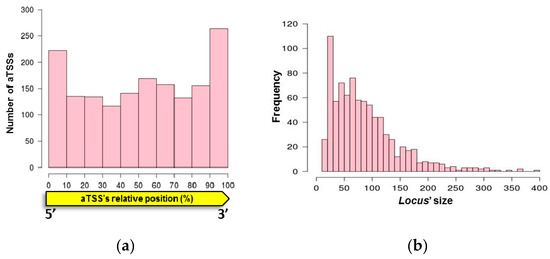 Antisense RNA (asRNA) properties. (a) Antisense transcription start site (aTSS) positions relative to cognate genes. (b) Size distribution of mapped asRNAs.