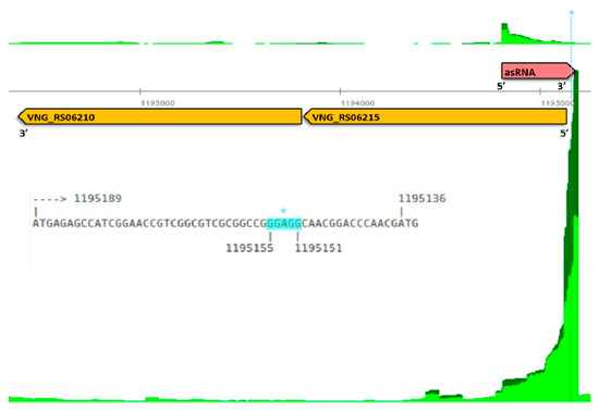 Antisense RNA in 5′ untranslated region (UTR). gcvP1, encoding a glycine dehydrogenase subunit (VNG_RS06215). VNG_RS06215 locus (orange arrow) is in reverse strand (5′→3′ right to left), neighbor gene VNG_RS06210 (orange arrow) is also in reverse strand. Differential RNA-sequencing (dRNA-seq) read coverage signal is shown in dark and light green for TEX+ and TEX− libraries, respectively. Coverage signals below and above the central axis are for reverse and forward strands, respectively. VNG_as06215_888 asRNA (pink arrow) encompasses Shine–Dalgarno-like signature (* light blue highlight in genome coordinates and zoomed in sequence).