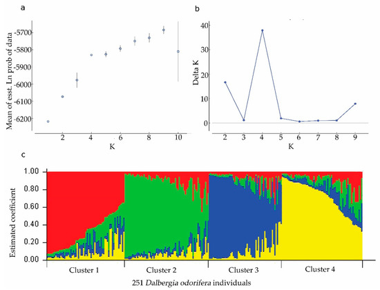Results of STRUCTURE analysis for 251 Dalbergia odorifera individuals based on microsatellite data. (a) Estimation of population using mean of estimated lnP(D) (log probability of data) with cluster number (K) ranged from one to ten. (b) Estimation of population using lnP(D)-derived delta K with cluster number (K) ranged from one to ten. (c) Four estimated clusters of the 251 D. odorifera individuals presented with different colors inferred by STRUCTURE analysis. Clusters 1–4 were presented by red, green, blue, and yellow, respectively. Each bar represented an individual, in which, different color represents the estimated membership coefficients using the Q statistic.