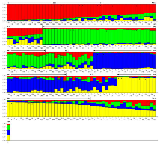 An admixture model-based approach was implemented to investigate the population structure of 251 D. odorifera individuals. The optimum cluster was four, which was generated from the STRUCTURE HARVESTER website with the largest lnP(D)-derived Δ K (log probability of data derived delta K) value (Figure 1a–c). Subsequently, the 251 individuals were classified into five populations based on their maximum membership coefficients, which were designated as RP1 to RP4, and a mixed population MIX (Figure 2). Among these populations (Table 2), MIX contained the largest amount of member 86 including 13 wild ones, followed by RP2 (51, three wild), RP3 (41, 15 wild), RP4 (41, six wild), and RP1 (33, five wild). The information on the geographic origins, types and inferred reconstructed populations is available in Table S1.