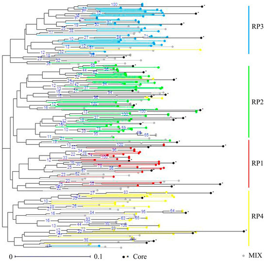 Details of hierarchal structure analysis on 251 Dalbergia odorifera individuals. RP1, RP2, RP3, RP4, and MIX: population code; *: core collection member; Arabic numerals: ID for each individual, see Table S1.
