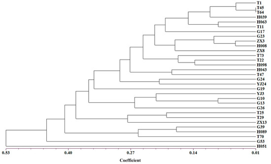 To conserve an overview for the whole genetic diversity of the germplasm, a core collection that contained 12.4% of the 251 D. odorifera individuals was constructed using the PowerCore software with the advanced M-strategy (Table S1). The core collection included 24 cultivated trees and seven wild trees, and harbored a total of 77 alleles with the observed allele number varying from two to seven per locus (Table S4). The observed number of alleles was 4.05, which was exactly the same as the whole database. Moreover, there was no significant difference on genetic diversity indices between the core collection and the whole database, and the observed and expected heterozygosity was 0.33 and 0.44, respectively (Table 5). Details on genetic diversity and variations statistics of the core collection were available in Table S5 and Table S6. Moreover, the NJ dendrogram tree showed that the core collection was uniformly distributed in the entire D. odorifera germplasm based on genetic dissimilarity (Figure 4), and based on the matrix of unbiased Nei’s genetic distance, the phylogenetic relationships among the 31 individuals was exhibited in the UPGMA tree (Figure 5).