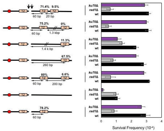 - Ma, J.L.; Kim, E.M.; Haber, J.E.; Lee, S.E. Yeast Mre11 and Rad1 proteins define a Ku-independent mechanism to repair double-strand breaks lacking overlapping end sequences. Mol. Cell. Biol. 2003, 23, 8820–8828. [Google Scholar] [CrossRef]
