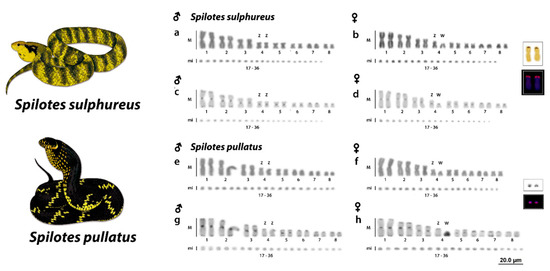 Both species presented a 2n = 36 chromosomes and 16 M and 20 mi. S. sulphureus presented 8 m + 4 sm + 2 st + 2 a and 20 mi, with a fundamental number (NF) equal to 50 for males (Figure 1a,c) and 7 m + 4sm + 2st + 3a M and 20 mi, and a fundamental number (NF) equal to 49 for females (Figure 1b,d). S. pullatus had 6m + 4sm + 4st + 2a and 20 mi for males (Figure 1e,g) and 6 m + 3 sm + 5 st + 2 a and 20 mi for females (Figure 1f,h). A remarkable heteromorphism was identified in both Spilotes species, evidencing the presence of a heteromorphic ZZ/ZW sex chromosome system. The sex chromosomes in both species correspond to the fourth pair. However, Z chromosomes are m and sm in S. sulphureus and S.pullatus, respectively. In both species, the W chromosomes were highly degenerated and were found to be a and st chromosomes in S. sulphureus and S.pullatus, respectively. (Figure 1B,F).