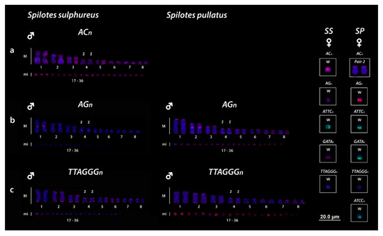 Mapping of (AC)n (a), (AG)n (b) and (TTAGGG)n (c) on the chromosomes of S. sulphureus and S. pullatus. ACn repeats were evidenced on the second pair of both species and on both Z and W chromosomes of SS but absent in the Z and W chromosomes of SP (a and highlighted in the boxes). Highlighted in the boxes are the differential accumulation of SSR repeats on the W sex chromosomes for SS (S. sulphureus) and SP (S. pullatus).