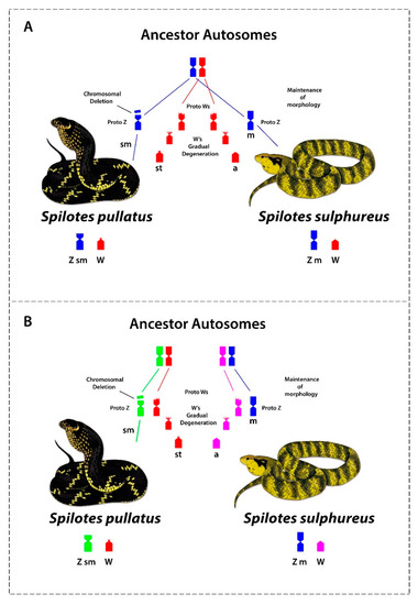Comparative cytogenetics revealed that at least 11 genes are shared on the Z chromosomes among ancestral (Henophidian) and advanced snakes (Caenophidian) [33], suggesting an evolutionary conservatism [35,39]. However, our data highlights the evolution and origin of sex chromosomes in our study species. Based on our data we propose two alternative scenarios: Scenario 1. ZW chromosomes of S. pullatus and S. sulphureus evolved from a common ancestral autosomal pair. The proto Z chromosomes have largely retained its ancestral morphology, except for a segmental deletion of the proximal region of the short arms in S. pullatus, while proto W chromosomes have undergone gradual gene loss and degeneration from the short arms, subsequently losing the entire short arms of W chromosomes in S. pullatus and S. sulphureus. The W chromosomes subsequently accumulated and amplified repetitive sequences, facilitating suppression of recombinations between Z and W chromosomes (Figure 4 and Figure 5a).