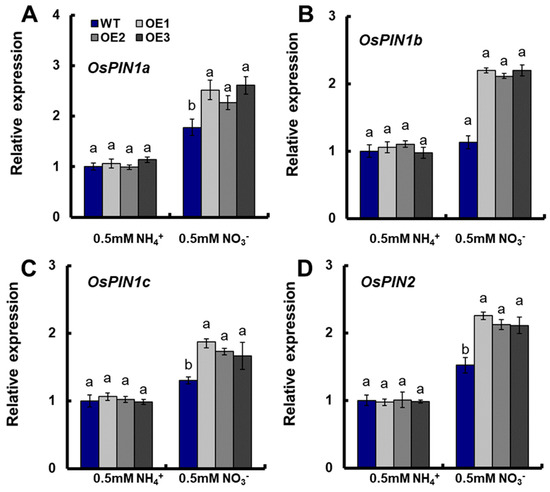 3.2. Effect of OsNRT2.1 Overexpression on the Expressions of OsPINs under 0.5-mM NH4+ or NO3− Conditions