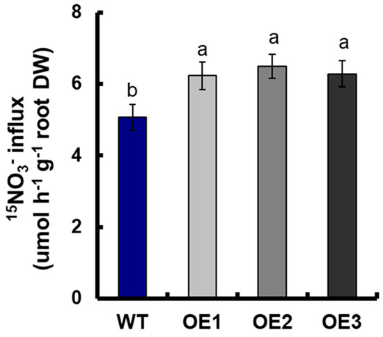 3.5. NPA Inhibits the Effect of OsNRT2.1 on 15NO3− Influx Rate in Roots under 0.5-mM NO3− Conditions