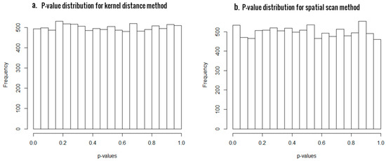First of all, we generated 10,000 simulated samples using and computed the p-values and the empirical type I errors at significant levels 0.05 and 0.01, in order to evaluate the statistical validity of the two approaches. The results are presented in Table 1, and the histogram plots of p-values for SSM and KDM in Figure 1a,b, respectively. For a statistical test to be valid, the p-values must be uniformly distributed between 0 and 1 under the null hypothesis. As evident from Figure 1, the p-value distributions are very close to uniform in both the cases, thus asserting the statistical validity of both our proposed methods. Also, the empirical type I errors are very close to the significant levels, confirming that both methods have excellent control of type I errors.