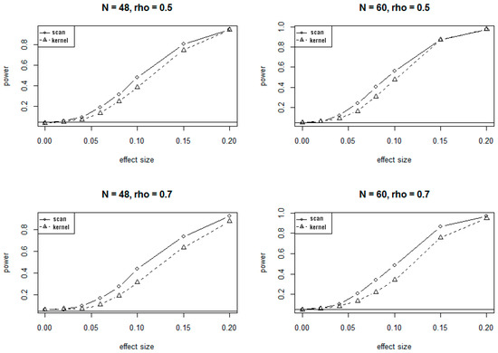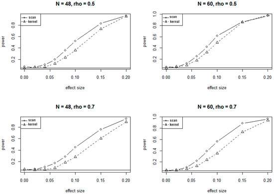 Because of the massive computing time needed for simulations under the alternate hypotheses, only 1000 simulations were conducted to evaluate the power of SSM and KDM under various alternate scenarios. The plots of power versus different values of effect sizes and correlations at 5% significance level are presented in Figure 2 and Figure 3, corresponding to the 24-site and 30-site regions, respectively. The plots show that values of the power for both SSM and KDM increase as the effect sizes increase, and as well as the sample sizes increase. It is also evident from the plots that SSM has uniformly higher power than KDM.