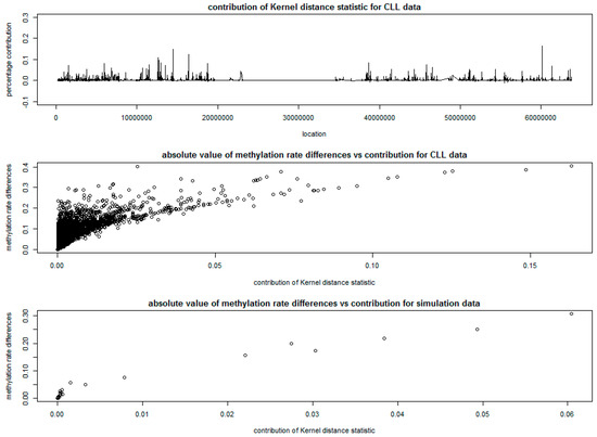 The percentage contribution of each CpG site to the kernel distance statistic is plotted at the top of Figure 4. The middle and bottom parts of Figure 4 give the plots of the absolute differences of methylation rates at each CpG site versus the percentage contribution of each CpG site to the kernel distance statistic, based on the CLL data and the simulation data. The absolute value of differences in methylation rates between cases and controls were calculated based on the ratio of adjusted methylation counts and sequencing coverage based on [20] at each CpG site for cases and controls.